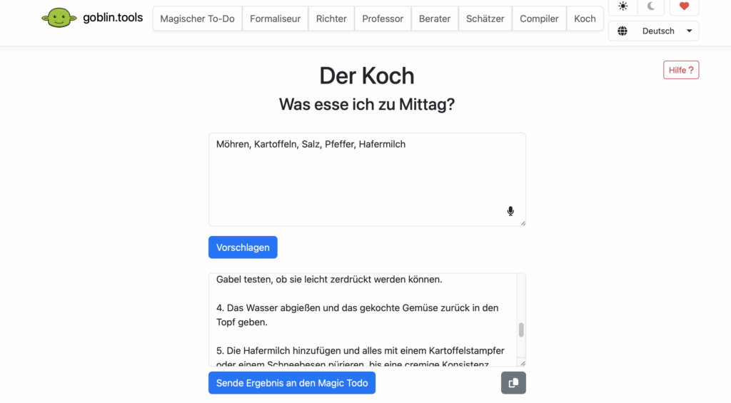 Man kann auch die integrierte Spracheingabe nutzen bei der Eingabe seiner Informationen und einige der Tools sind miteinander verknüpft – so kann man z. B. beim „Koch“ seine Zutaten eingeben und das Rezept dann noch an den „Magischen To Do“ schicken:
