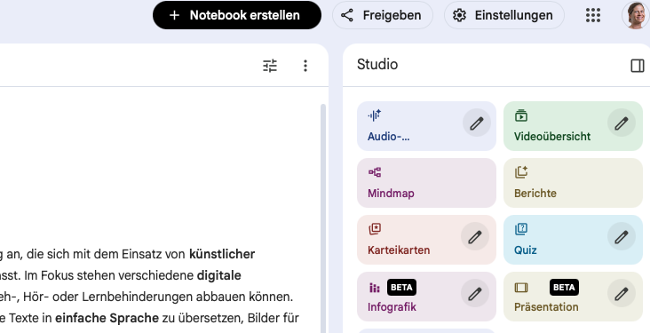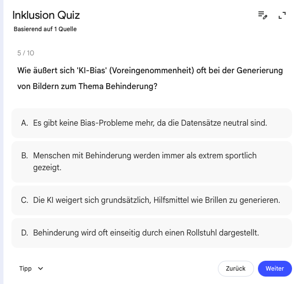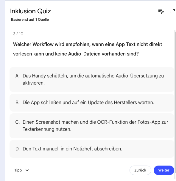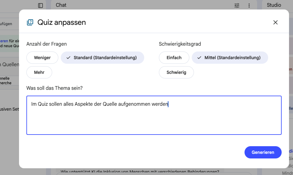 Notebook LM wurde vor allem als Podcast-Tool bekannt: Man lädt beliebige Quellen und Materialien hoch und heraus kommt ein natürlich gesprochener Zwei-Sprecher*innen-Podcast. (Weitere Infos: Diklusive Bildung durch KI-Podcasts: Ein Weg zu mehr Teilhabe und Inklusion?!) Darüber hinaus stellt Notebook LM diverse weitere Instrumente zur Verfügung, z. B. könnte aus dem Material ebenfalls ein Erklärvideo, eine Mindmap, Karteikarten, eine Infografik, einen Bericht oder eine Präsentation erstellt werden. Oder eben Quizfragen!