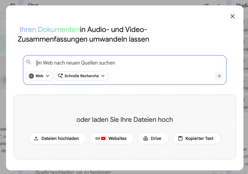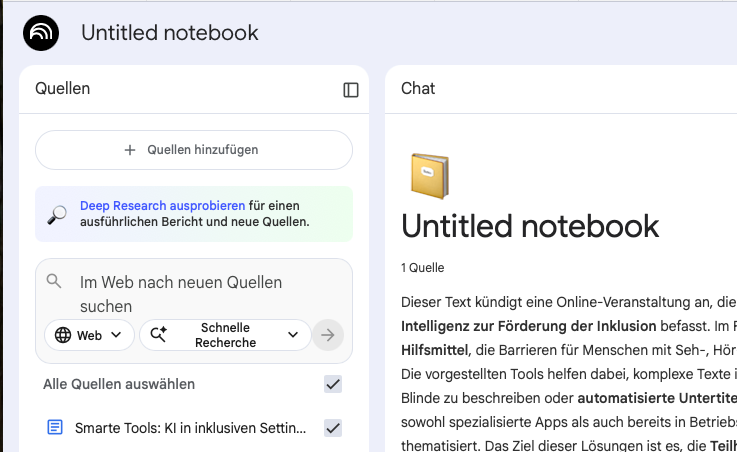 Im Beispiel habe ich z. B. die Notizen hochgeladen, die ich mir zur Vorbereitung eines Workshops zum Thema „Einsatz von KI in Medienprojekten“ gemacht habe. Im Beispiel wurde nur ein Dokument bestehend aus Stichpunkten und einigen Links hochgeladen, man könnte noch weitere Quellen ergänzen: